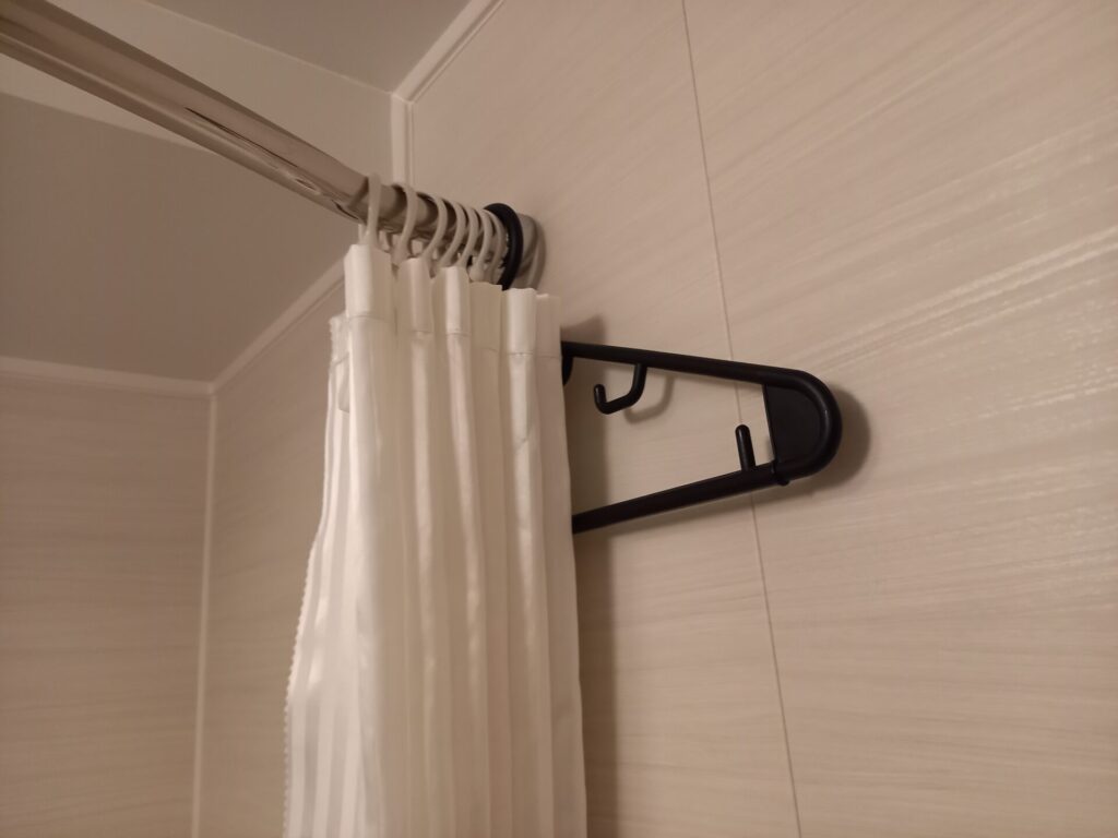 カーテンレールにはハンガーがかけられていて、洗濯が必要になっても干すことができます。