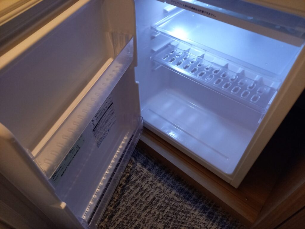 冷蔵庫もコンパクトですが、飲み物などを入れるには十分です。