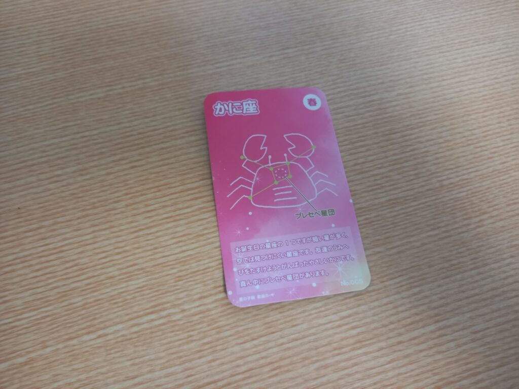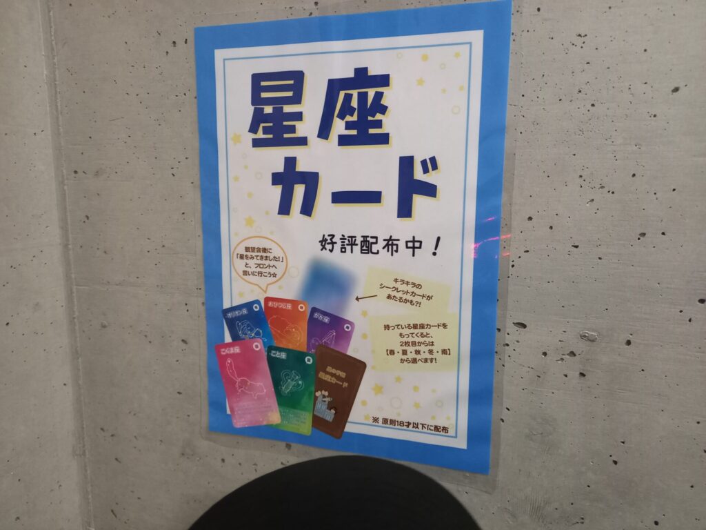星空観察会に参加すると、最後に合言葉を教えてもらってフロントで星座カードがもらえます。