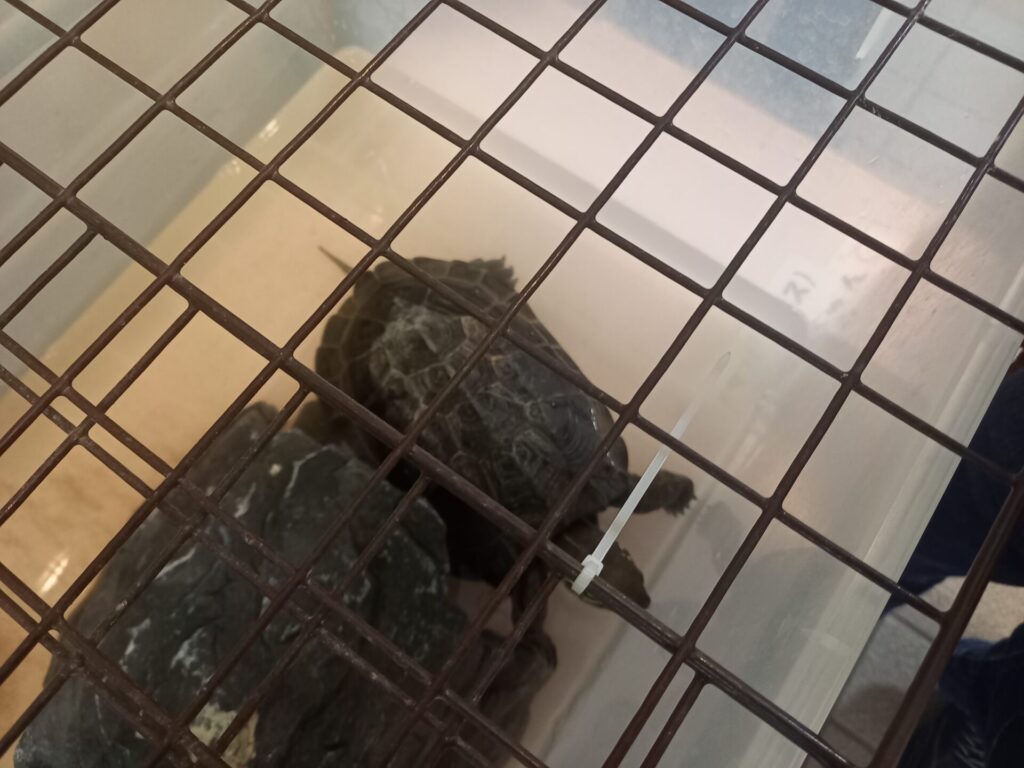 トランポリンよりも、カメのガメラちゃんに夢中になった息子でした…