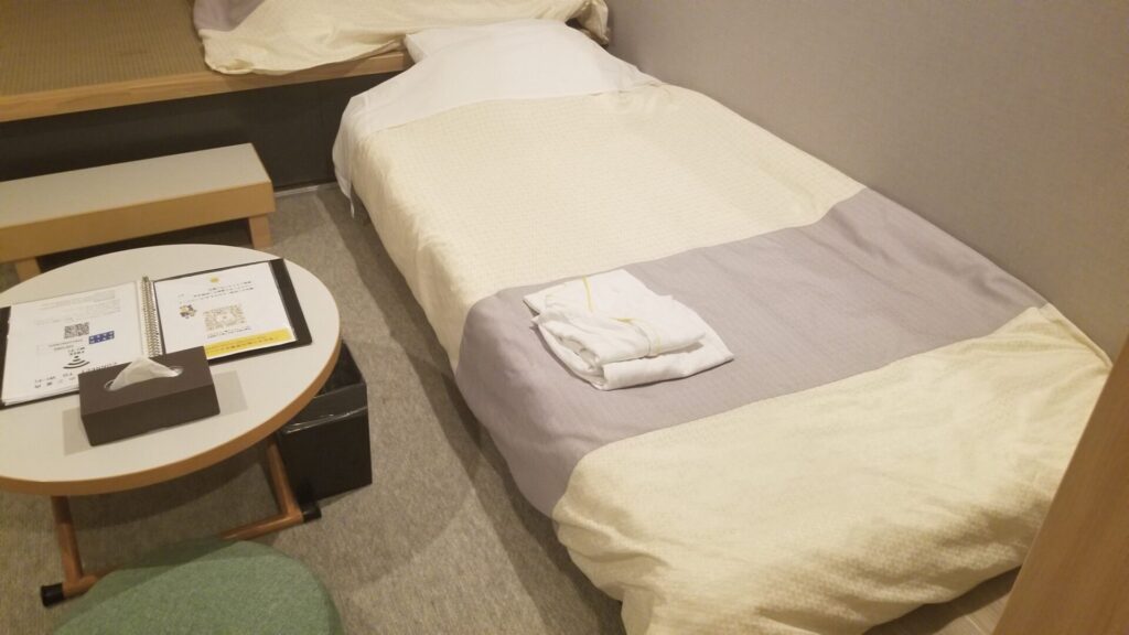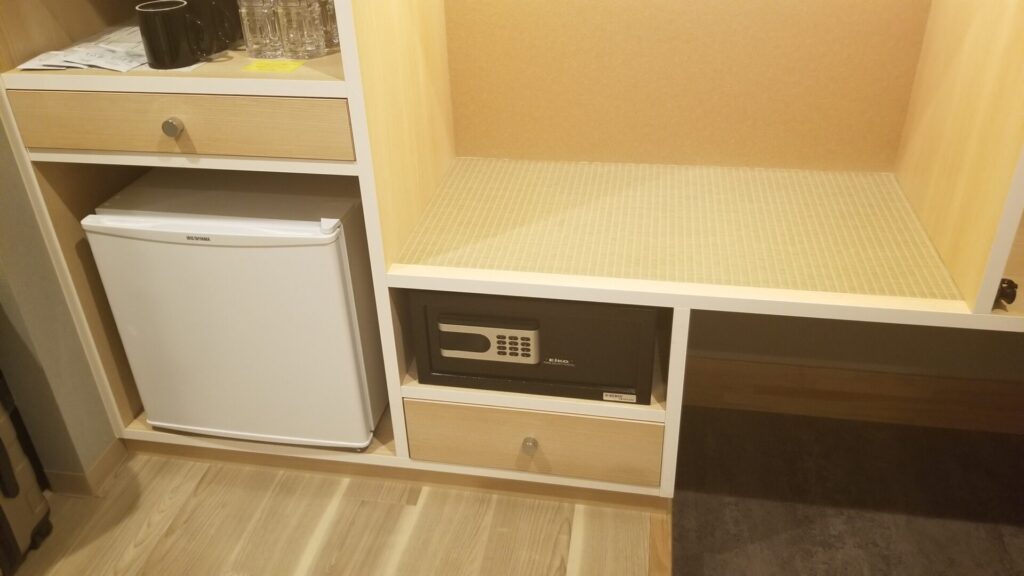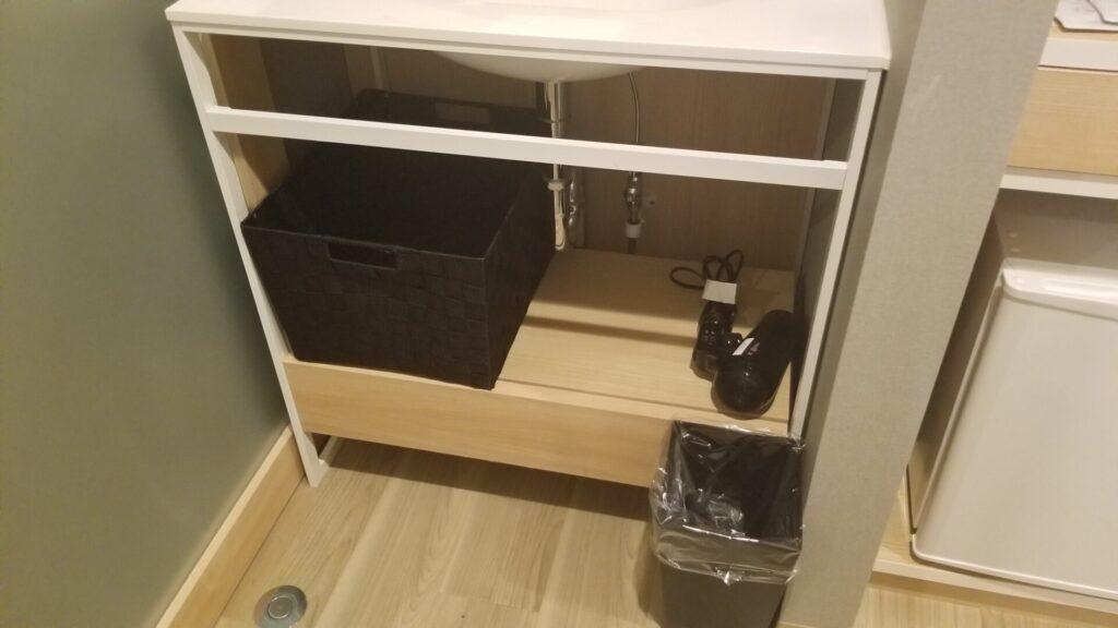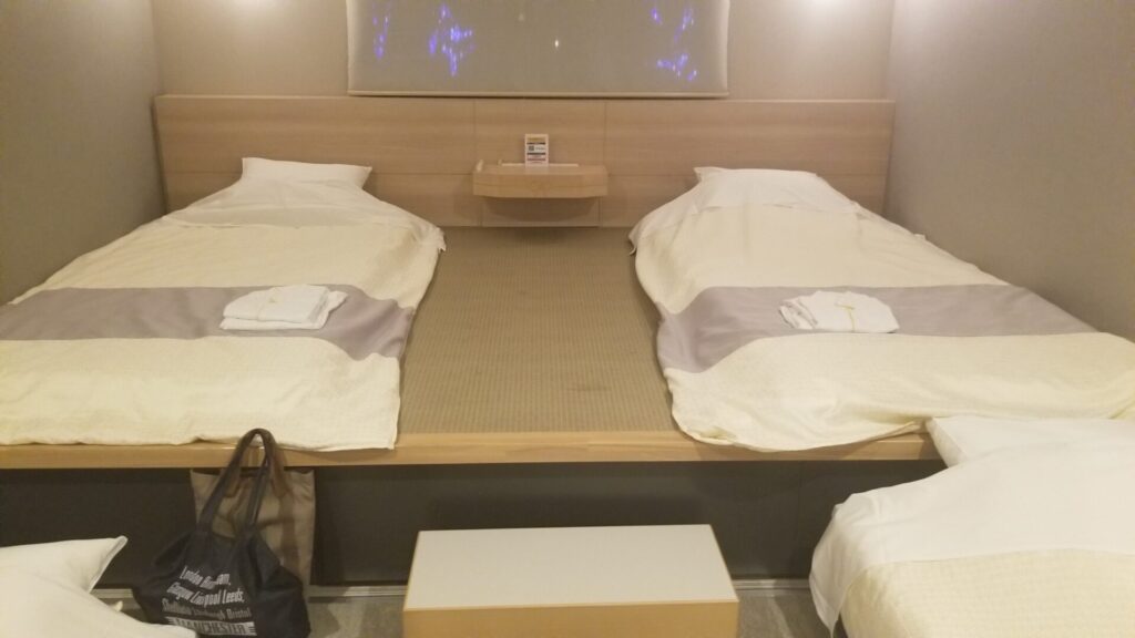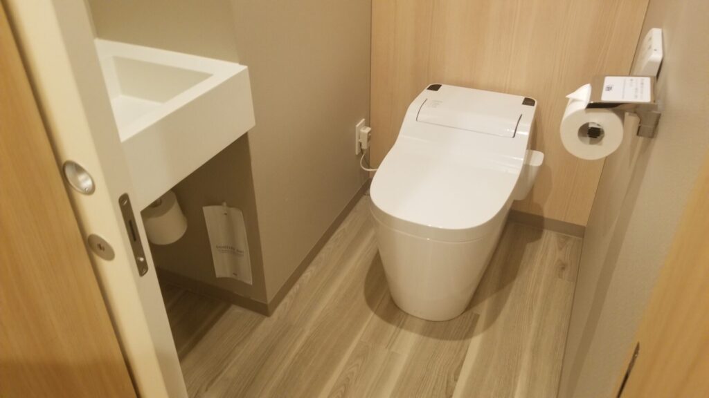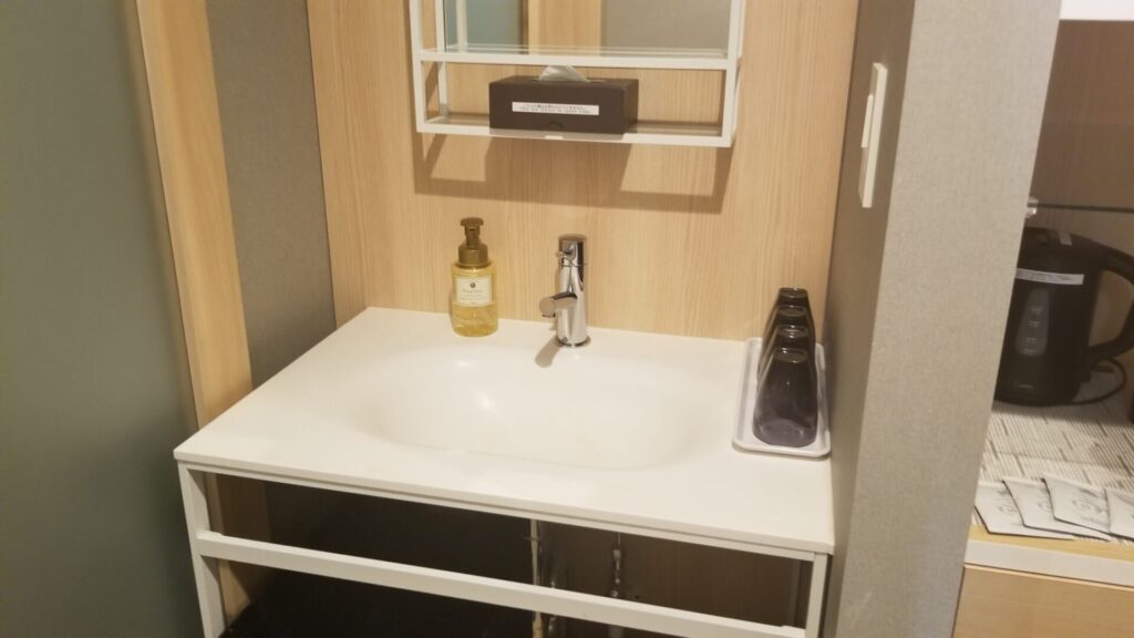 客室入り口を開けるとすぐ脱衣所のような形になっているので、誰かがお風呂に入っている時に客室を出たり戻ったりする場合には気を付けた方がいいかもしれませんね。