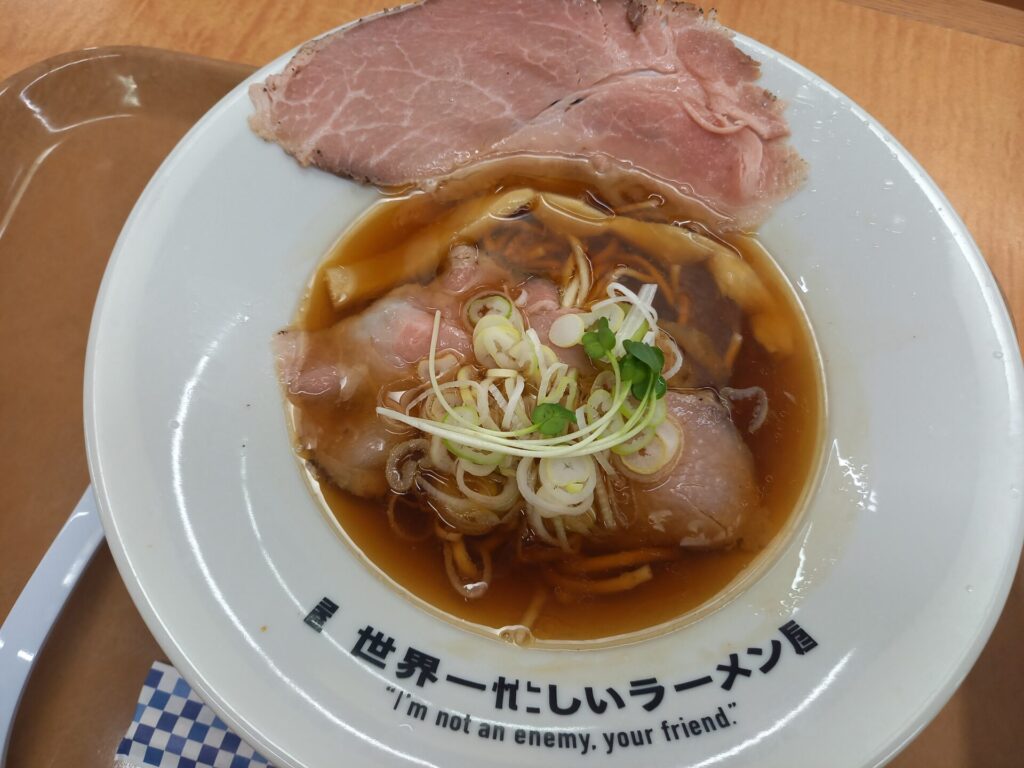 世界一忙しいラーメンは、中国道の加西SA下りにもあり、こちらは醤油ではなく、チャーシュー2枚に魚介ベースのようでした。