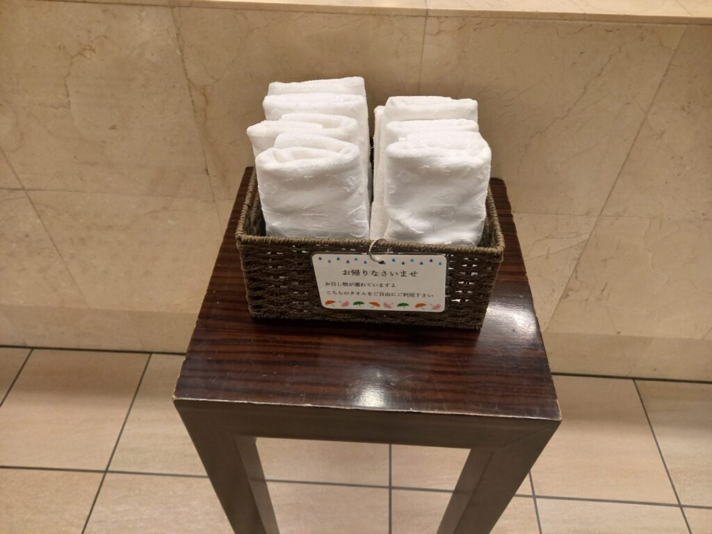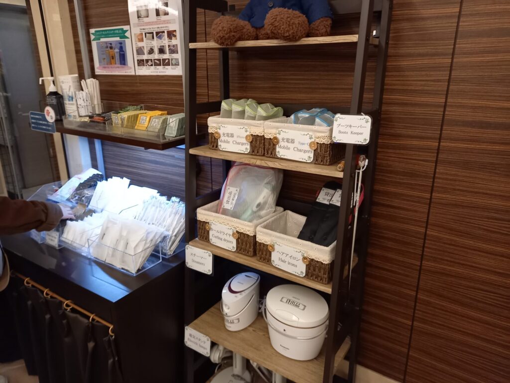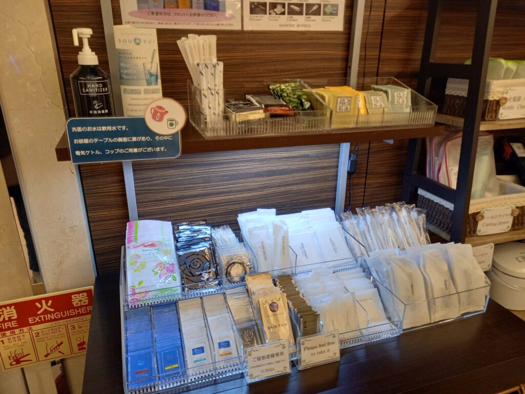 ロビーにフリーアメニティコーナーがあるので、必要な量を自分でとることができます。