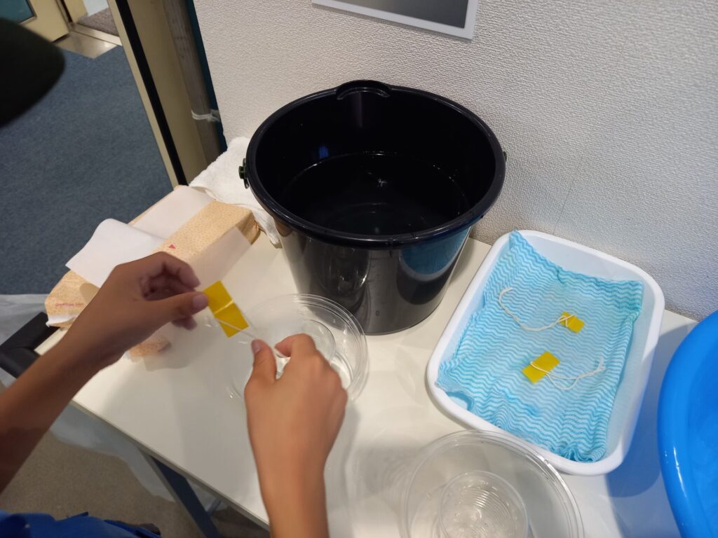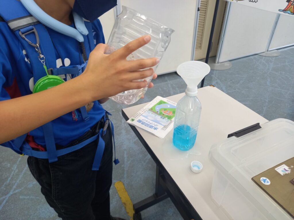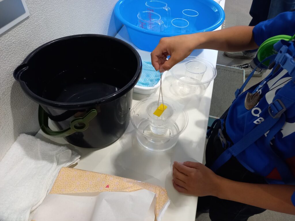 こちらは、お水を入れたコップに透明パネルを密着させるとお水をこぼさずに持ち上げられるという実験ができました。