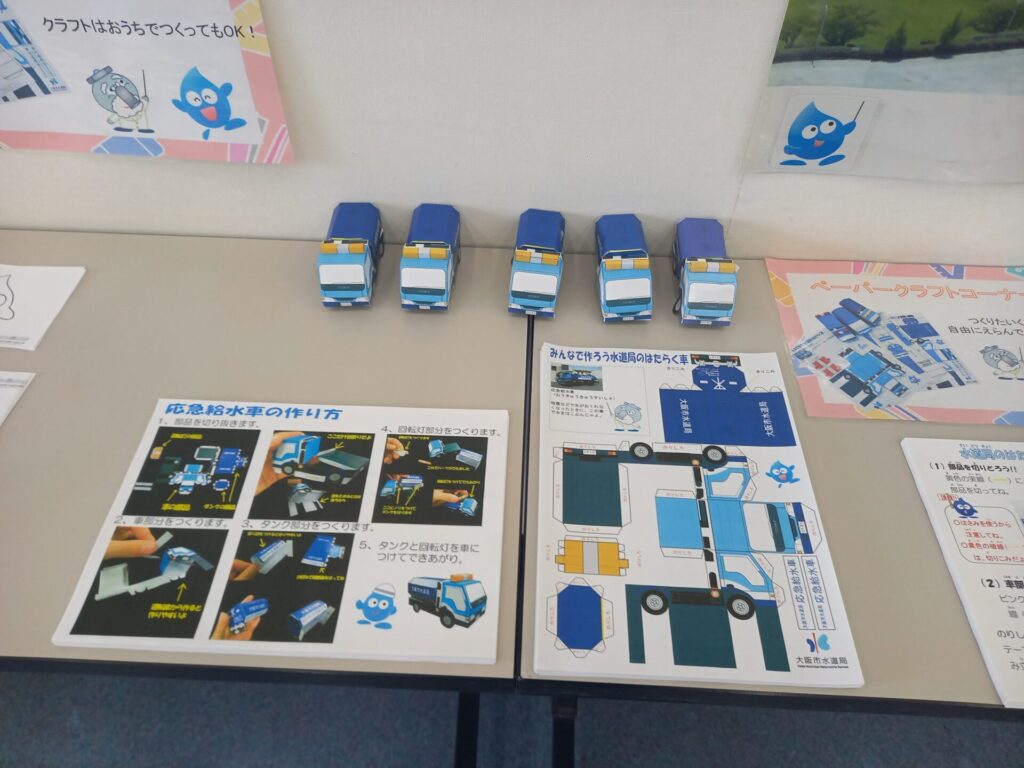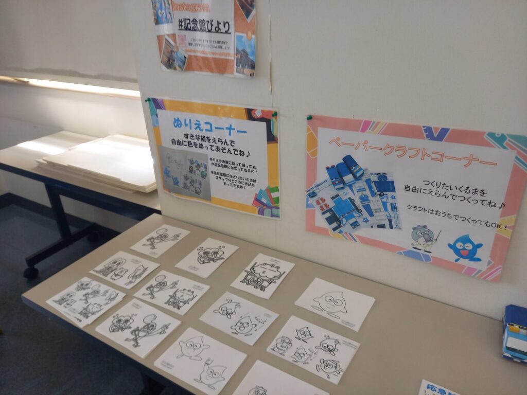 資料展示スペースでは、ペーパークラフトや塗り絵などがもらます。